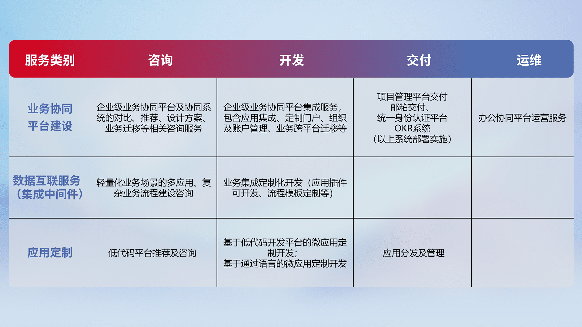 针对钉钉、、、企微、、、、IDaas等平台级产品提供产品的规划、、方案、、交付、、定制化开发等服务,,,实现如统一协同办公、、、、智能客户服务、、、、混合会议管理、、、、智能数据查询、、、、等业务场景,,,实现数字化转型。。。。